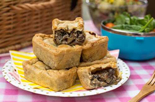 Mini mushroom picnic pies! Creamy, garlicky mushrooms wrapped in crispy pastry - utter heaven! Perfect for a vegetarian picnic.