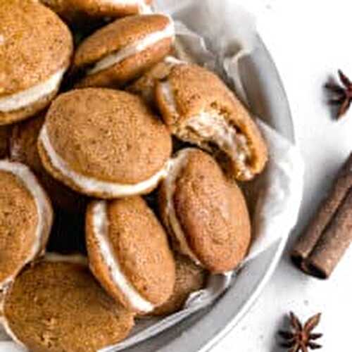 These mini pumpkin whoopie pies are packed full of cozy warm fall spices along with a sweet maple cream cheese frosting to make the most delicious bite size dessert.