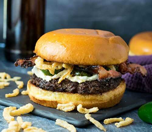 A gooey, cheesy, stuffed burger featuring all your favorite game day flavors: jalapeno, cheddar, bacon, beer, and onion rings.