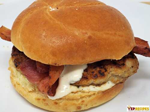 A seasoned ground chicken patty topped with thick sliced bacon and Alabama white barbecue sauce.