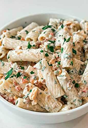Craving a crowd-pleasing dish for summer BBQs? Try my Bacon Ranch Pasta Salad! Tender pasta, crispy bacon, and fresh veggies are tossed in a creamy ranch dressing for a flavor-packed, delicious pasta salad.