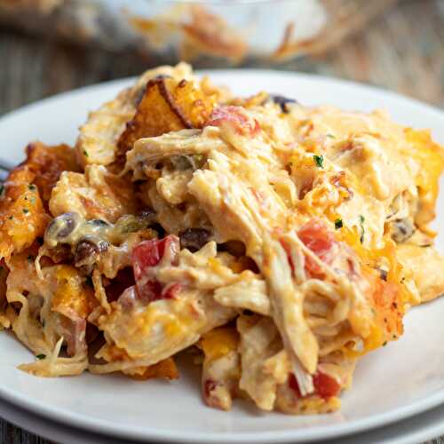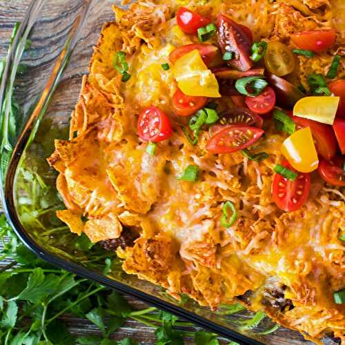 This quick, cheesy Doritos chicken casserole is tasty enough for any night of the week! My decadently cheesy casserole uses crushed Nacho Cheese Doritos as the crust and topping.