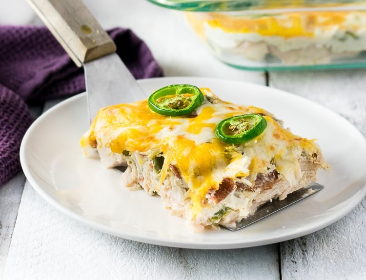 This decadent jalapeno popper chicken casserole is loaded with tender chunks of chicken breasts smothered in ranch infused cream cheese, crisp bacon, bold jalapenos and a blanket of melted cheese.
