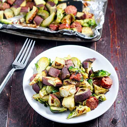 Sheet Pan Bratwurst, Sweet Potato, & Brussel Sprouts is the easiest dinner you will ever make, just chop, spread across a sheet pan, and bake!