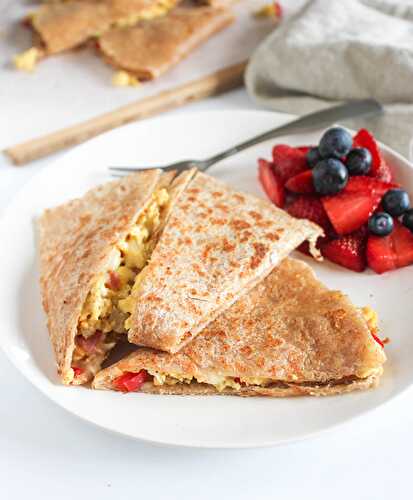 This Easy Breakfast Quesadilla recipe is made with fluffy scrambled eggs, diced bell peppers, crispy bacon and gooey cheddar cheese.