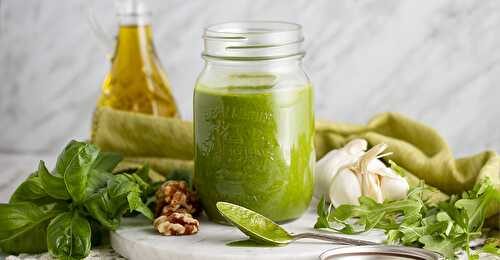 This vegan arugula and walnut pesto is a nice switch from your standard pesto with peppery arugula paired with the sweet basil and walnuts.