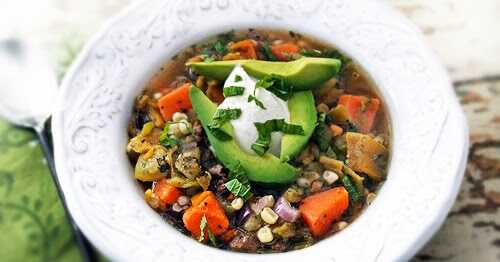 Healthy, gluten-free, vegan Parsi Wedding Stew of sweet potato, carrot, green peas, bell peppers, flavored with cider vinegar, sugar, Worcestershire sauce.