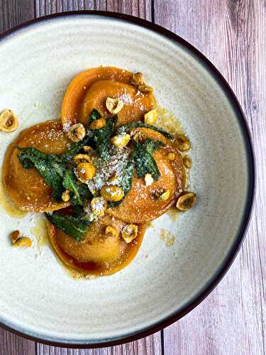 Butternut Squash Ravioli is the perfect fall or winter dish, especially with brown butter, fried sage and hazelnuts.