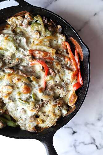 This easy Philly Cheesesteak Skillet is simple and loaded with flavor! Caramelized onion, bright bell peppers and tender steak make this the a perfect one pan meal!