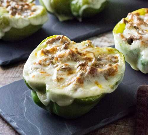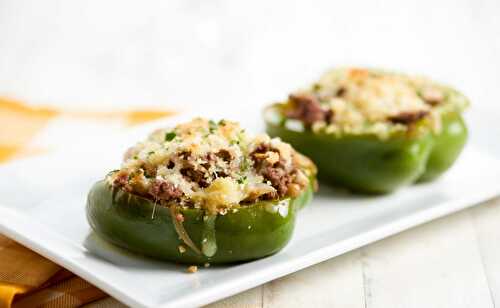 These Philly cheesesteak stuffed peppers are loaded with flavorfully seasoned beef, mushrooms, and onions lying under a melted blanket of provolone cheese.