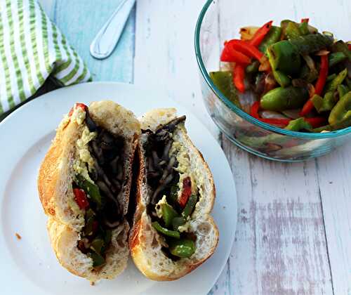 Portobello mushroom cheesesteak sandwich is made with meaty portobello mushrooms, peppers, onions and vegan cheese for a vegan version of a classic sandwich.