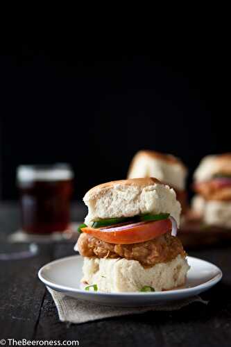Fried Beer Chicken Sliders with Beer Pickled Peaches and Jalapenos