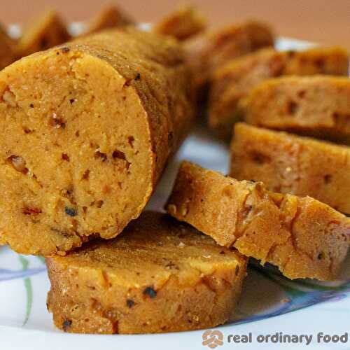 This recipe uses okara (the leftover pulp from making soy milk) for a tasty zero-waste vegan sausage.