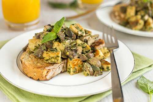 Creamy pesto mushrooms and halloumi on toast - quick and easy to make, and sooo yummy! Serve it on toast for the perfect vegetarian brunch.