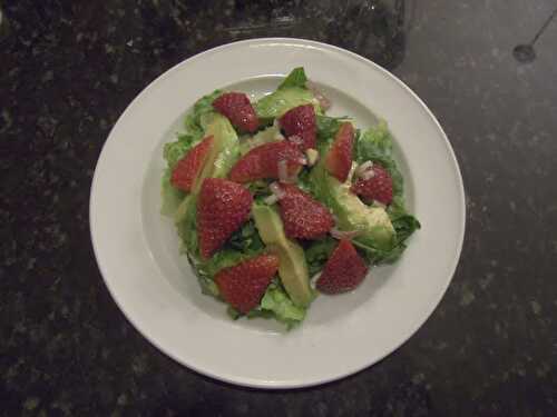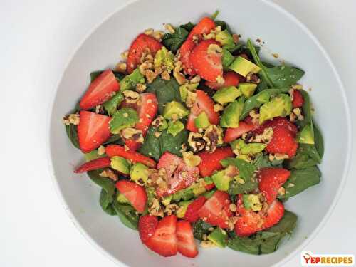 Strawberries and avocado on a bed of baby spinach drizzled with a white balsamic vinaigrette and topped with walnuts.