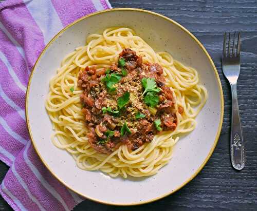 This walnut and bean bolognese is an easy veggie version of spaghetti bolognese, made only with store cupboard ingredients!