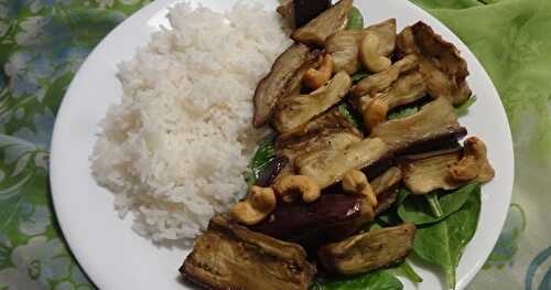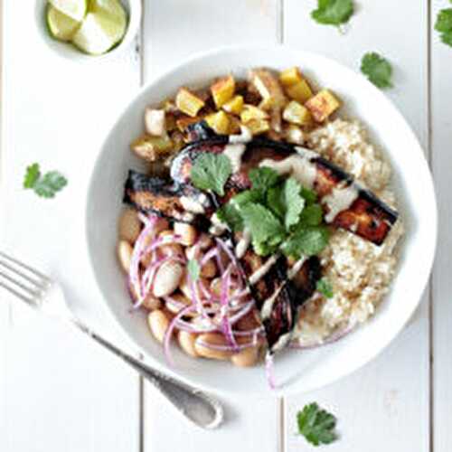 Vegan comfort food at its best: Rice + roasted potato & bean bowl with aubergine bacon.