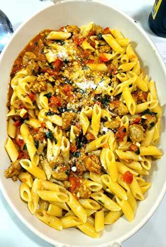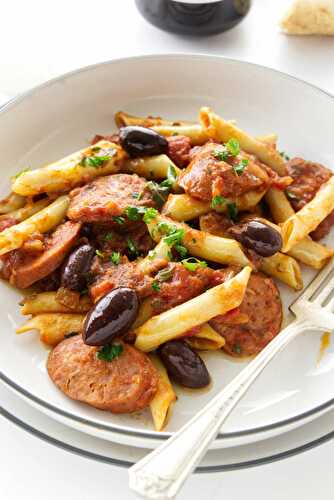 Penne Arrabiata with smoked sausage is an Italian favorite! Penne pasta, smoked sausage and Kalamata olives are tossed in a rich tomato-based, spicy sauce.