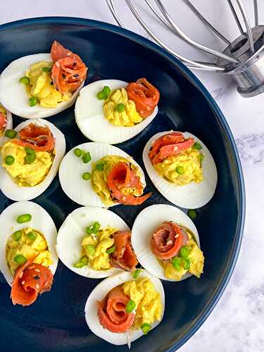 My new recipe for Smoked Salmon Everything Bagel Deviled Eggs has the flavors of the traditional bagels and lox in ONE beautiful big bite.