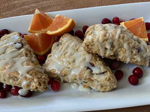 Shortbready scones, made with fresh oranges, craisins, blond raisins and walnuts iced with orange juice icing.