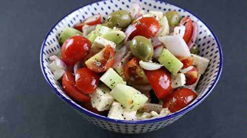 This easy-to-make Greek salad is a wonderful medley of Mediterranean vegetables that makes a perfectly refreshing side salad for any meal! Crisp veggies, salty feta cheese, and a homemade Greek dressing put this salad over the top!
