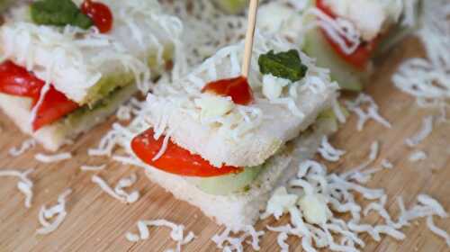 Veg club sandwich are made using three toasted bread with vegetables, lettuce, mayonnaise and caramelized onions layered over them .