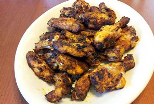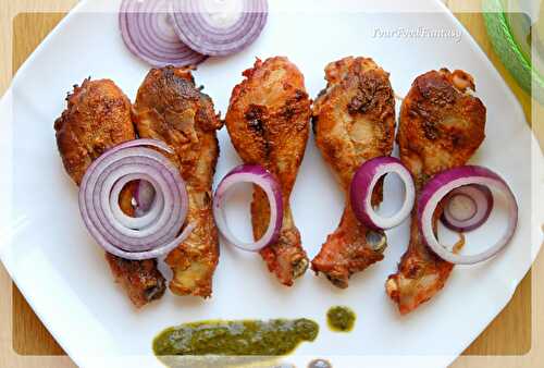 Lollipops made from chicken wings are marinated in tandoori masala and grilled or baked in an oven or over a charcoal tandoor till crisp golden.