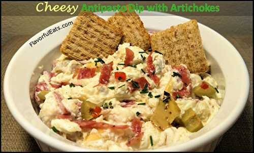 Cheesy Antipasto Dip with Artichokes combines all your favorite antipasto items like salami, artichokes, olives, and cheese into a warm and cheesy dip.
