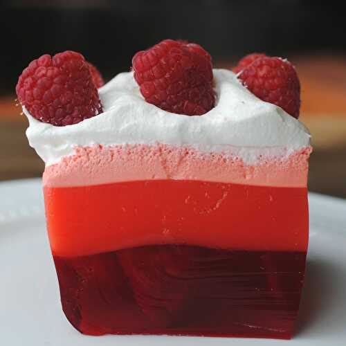 Delicious sugar-free Jello, layered with creamy whipped cream and raspberries!