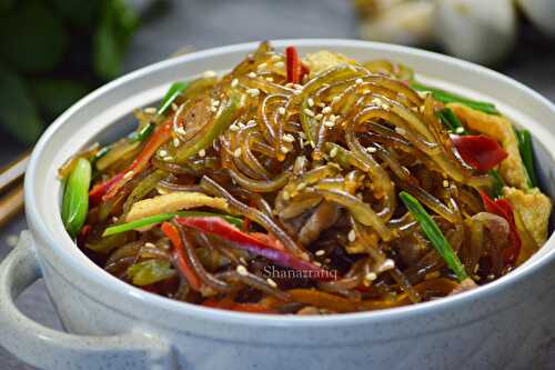 Japchae is a classic Korean dish made with sweet potato starch noodles.