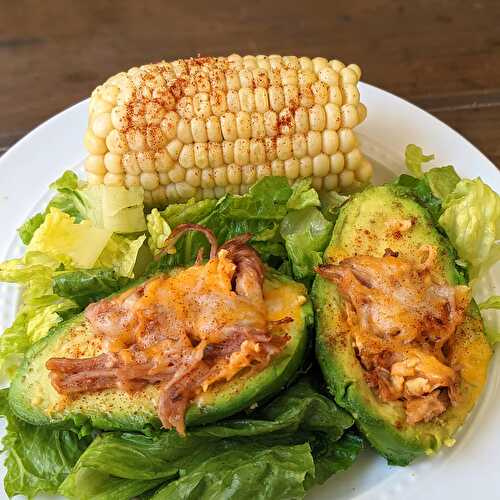 Delicious low carb meal; shredded pork, and low calorie cheese, baked inside an avocado bowl.