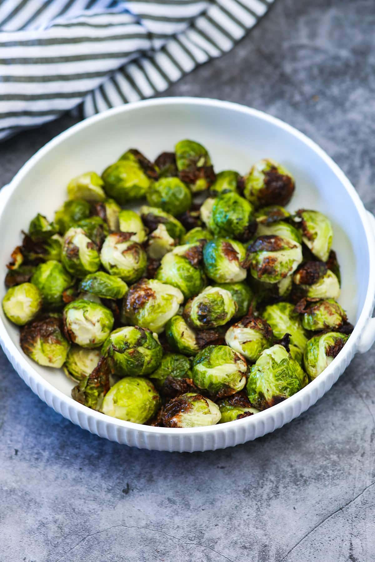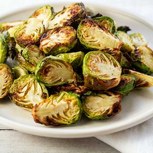 Crispy air fryer brussels sprouts lightly seasoned with garlic powder, salt, and pepper.