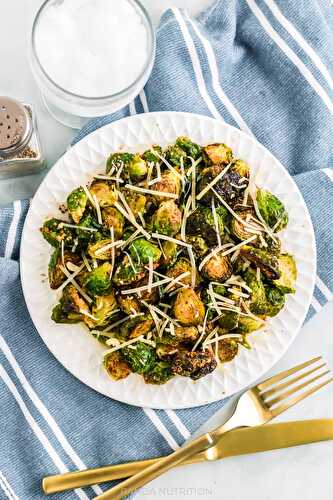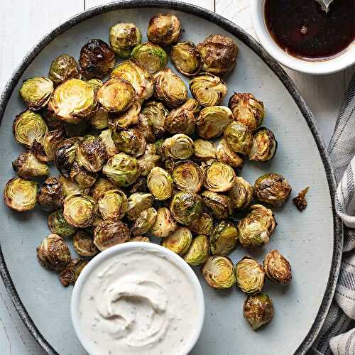 Recipe for how to cook Brussels sprouts in the air fryer, plus 3 ways to serve them: with balsamic glaze, Parmesan-garlic or yogurt-miso sauce.