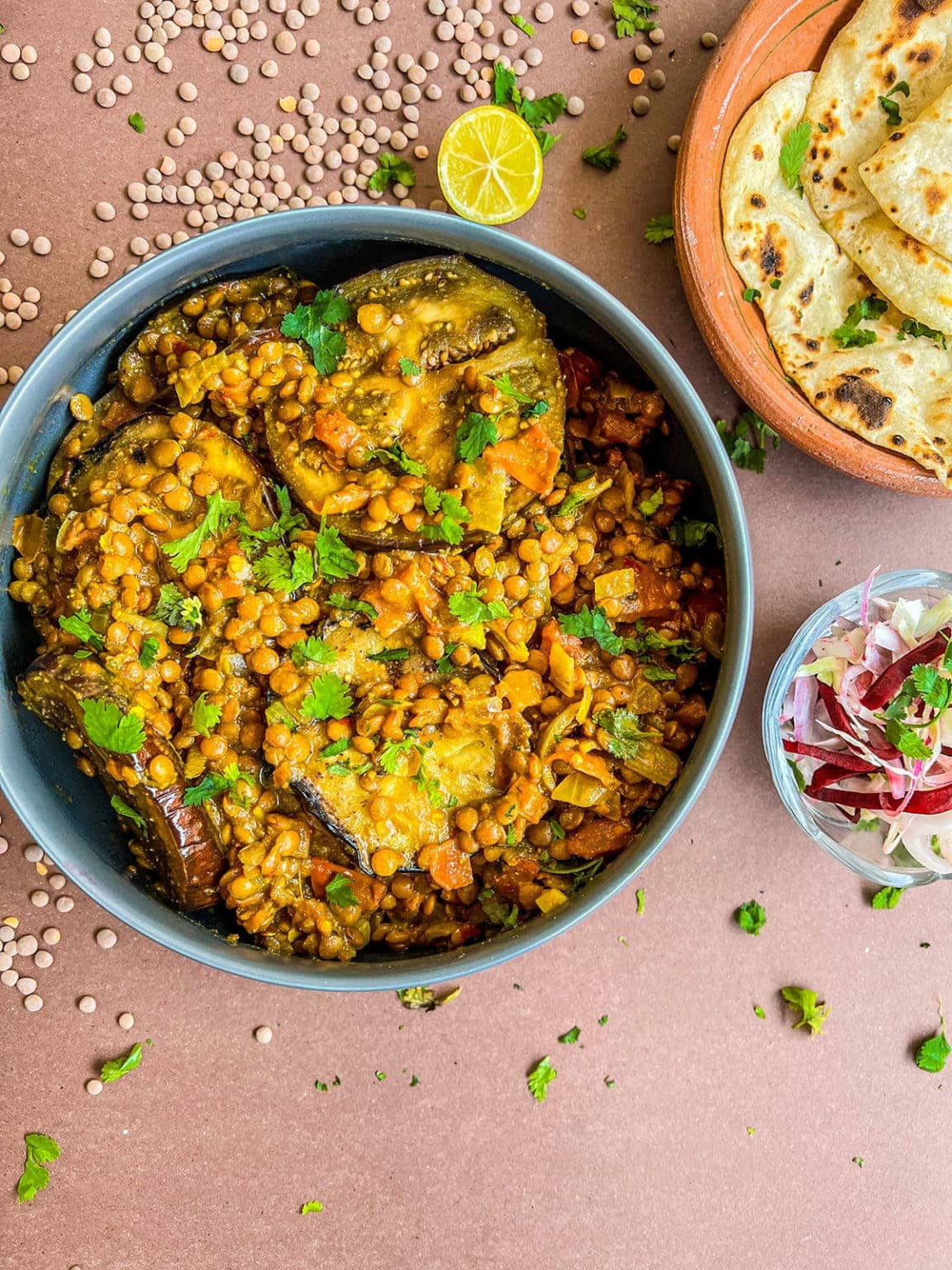 Your new go-to weeknight supper will be this aubergine and lentil curry, which comes together in only 30 minutes.