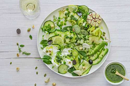 A fresh green lukewarm salad of green vegetables with a creamy Burrata cheese, nuts and seeds mixture, finished with a parsley pesto.
