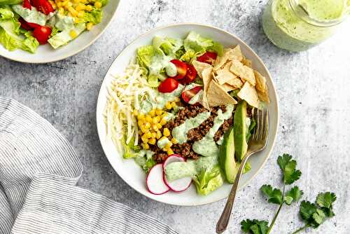 This healthy taco salad has it all: warm spiced meat, cool romaine lettuce, a slew of crunchy toppings and a Creamy Cilantro Lime Dressing.