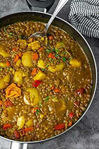 Creamy Jamaican coconut lentil curry, made with green lentils cooked in a flavorful coconut curry sauce, seasoned with onion, garlic, thyme, green onions, ginger, and Scotch bonnet pepper, and loaded with potato, carrot, and dumplings.