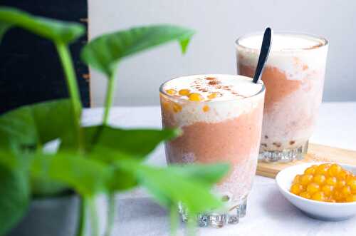 Creamy carrot and banana smoothies served with boba pearls and topped with sweet and salty cream cheese mixture.