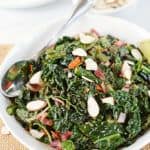 Simple sauteed kale with garlic and onions - a flavorful and healthy side dish that's easy enough for a weeknight dinner and fancy enough for your holiday table.