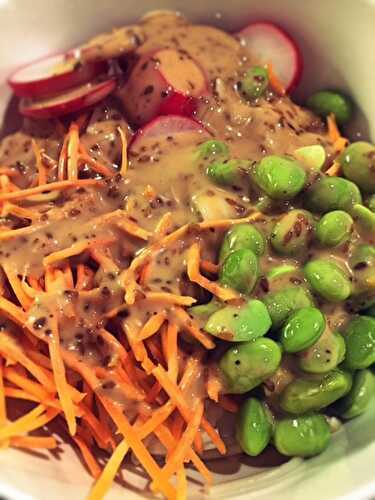 Rice noodles and juicy shrimp pair up with carrot, edamame and radish to make Asian salad with sesame dressing.