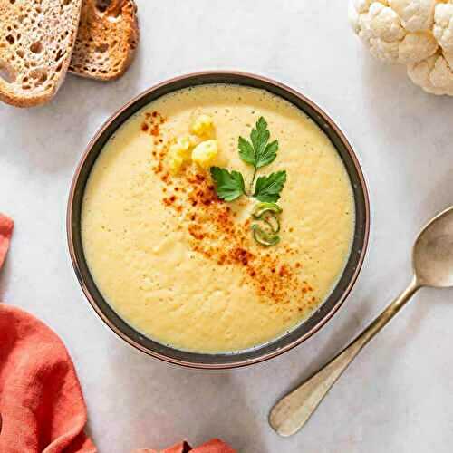 This Creamy Roasted Cauliflower and Red Pepper Soup [vegan] is packed with healthy ingredients and delicious flavors.