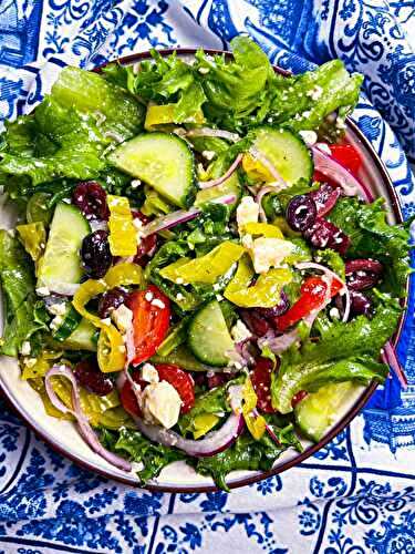 If you want a big, classic Greek salad, this recipe is for you! A bunch of Mediterranean veggies, olives, and feta tossed with lettuce and a simple lemony dressing, this Greek salad is a perfect side salad or full meal with a protein.