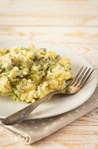 Warm potato salad with fresh dill, pickles and vegan sour cream.