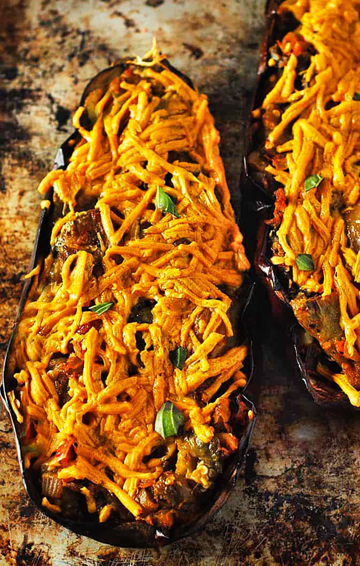 This eggplant gratin recipe combines eggplant slices with a creamy, cheesy sauce as well as a tomato or marinara sauce.