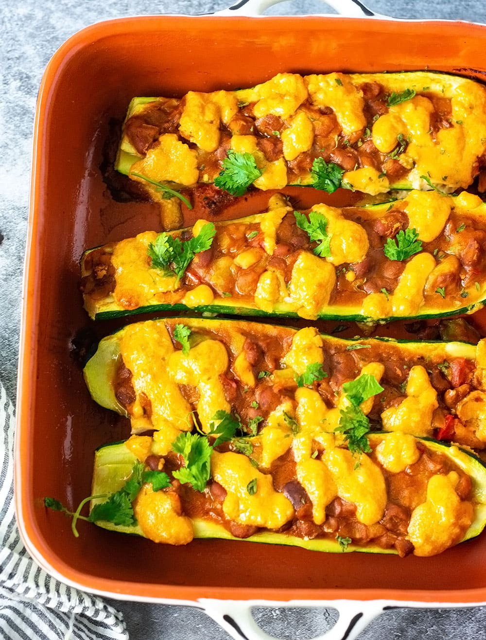 Light and healthy dish - quinoa stuffed zucchini boats with vegan walnut Parmesan.