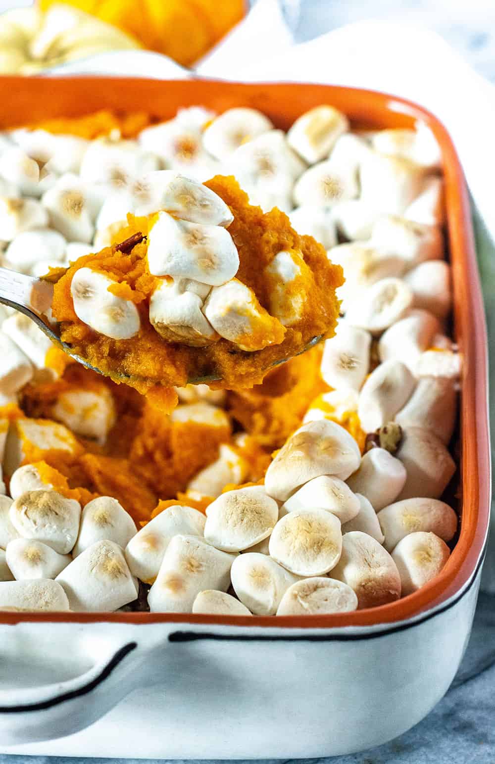 Sweet potato casserole (with marshmallows) is a classic holiday side dish that tastes more like dessert than it does potatoes! Warm fall spices, brown sugar, pecans, and of course, mini marshmallows, highlight the natural flavor of the sweet potatoes.
