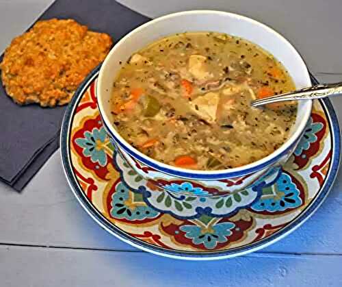 Chicken, Wild Rice Soup; made with the carcass of a roast chicken and full of vegetables and wild rice.