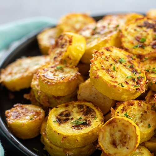 My easy-to-make roasted yellow squash is an amazing side dish of fresh yellow summer squash with garlic powder and Parmesan cheese! Crookneck or straightneck yellow squash is sliced then roasted until tender and delicious! You’ll wonder why you ever.