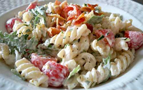 Creamy avocado dressing provides a healthy and delicious twist to BLT pasta salad.