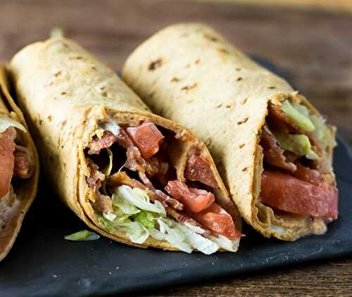 These flavorful BLT Wraps are loaded with crisp thick cut bacon, fresh lettuce, basted tomatoes and a mouthwatering sauce that makes this BLT completely out of this world!